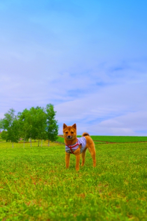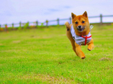 広大な丘に走る小さなぽんちゃん。