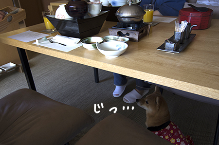 テーブルの下で気配を殺して配膳を見守るぽん。