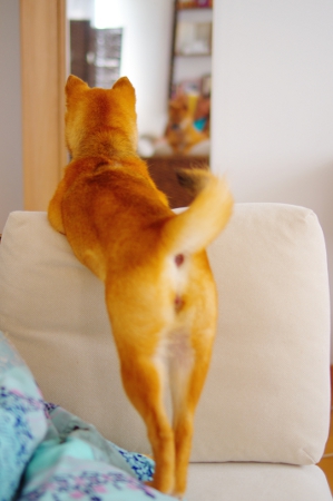 鏡を見つめるぽんちゃん。
