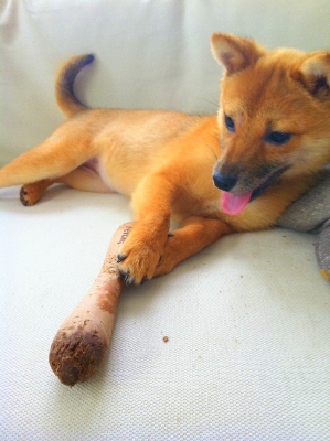 家干しの洗濯物を噛んで引っ張って床に落として振り回す…という一連の遊びになっていますが、毎回それをされると困るので、そんな時は骨ガムか、一番喜ぶのは、本物の骨です