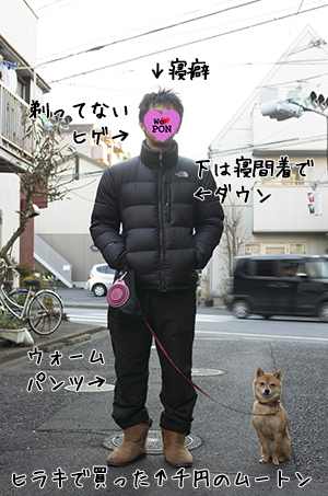 という朝起きぬけのおっさん丸出しスタイルで行っていたのですが、(暗いからどうでもいいと思っていたし、道で会う散歩の人も大体こんな感じだった)