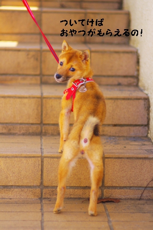 少しひっぱって、自ら歩いたらすぐ、誉めてオヤツを与えましょう。