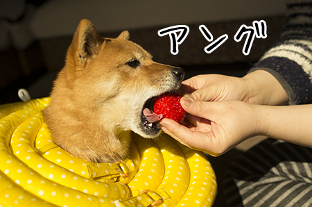 口に入りそうなものはとりあえず一口でいこうとする欲張り犬、ぽん。